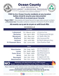 Borough of Point Pleasant – The Ocean County Board of Commissioners is once again hosting their free document shredding program at different locations throughout Ocean County.  Please see the attached flyer for all locations and times including a session in Point Pleasant Borough on June 27th at 2300 Panther Path from 9AM – 12PM.  You can read the full press release for all information by click here: 2026 Ocean County Document Shredding Press Release