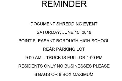 Document Shredding Event Saturday, June 15 Point Boro High School 9AM-1PM or until the truck is full Residents Only, No Businesses Please 6 Bags or 6 Box Maximum